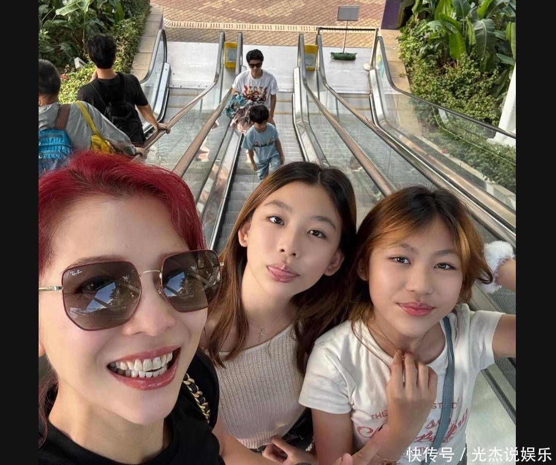 在合照中,两姊妹的样貌越来越标致,不但遗传了妈妈的优良基因,拥有一双大长腿,而且面对镜头毫不怯场,摆出各种自信的姿势,星味十足。